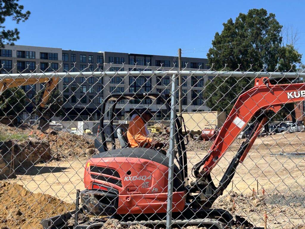 A construction worker operates a backoe at a Durham, North Carolina construction site.