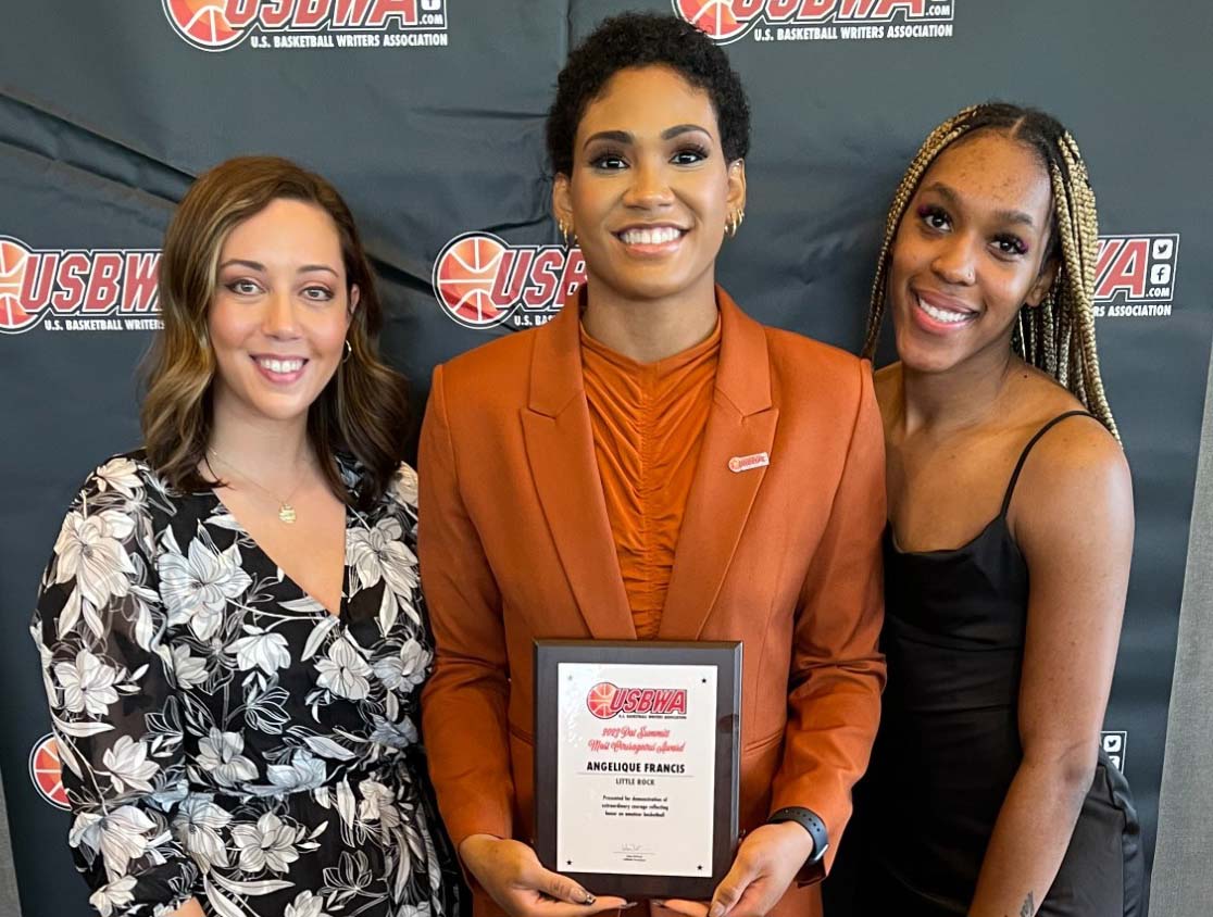 As Angelique Francis wrapped up her remarks after being presented the 2023 Pat Summitt Most Courageous Award from the U.S. Basketball Writers Association (USBWA), the room full of writers, coaches and notable people from the sport of women’s basketball jumped to their feet in a standing ovation for the Little Rock forward.