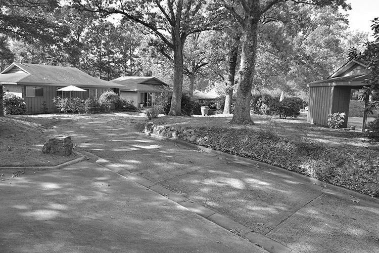 The architect for the project was Jack Downs’s brother, Lawrence, an architect in Kansas City, Missouri. The redevelopment of the property was undertaken in stages beginning circa 1965. The first four houses built included the houses at 4214, 4216, and 4218 Fairview Road and 4201 South Lookout, which were built to the north of the Allsopp House. Once the first four houses were built, the Downses demolished the Allsopp House and reused the house’s brick in the construction of the houses at 4208, 4210, and 4212 Fairview circa 1969. Some parts of the house were also used in the construction of the Downs family’s own house at 4206 Fairview, and the basement of the Allsopp House was reused in the construction of the neighborhood’s swimming pool located in between 4210 and 4212 Fairview. The Allsopp House’s driveway was also retained and reused as the central street of the neighborhood.