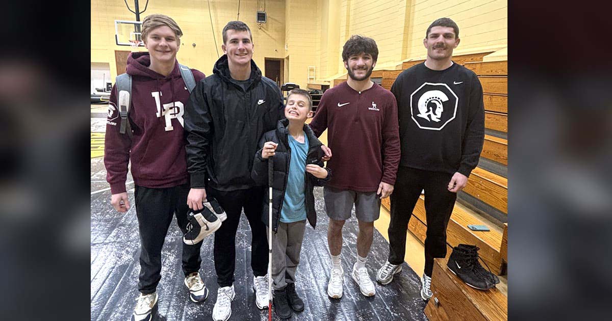 UA Little Rock wrestlers pose for a photo with Griffin Smith, a fourth grader in the Blind Department at the Arkansas School for the Deaf and Blind.
