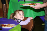 Naomi Hole, daughter of Brenda and Michael Hole, can hardly wait for the plate of pancakes her daddy is bringing, at a pancake supper recently at St. Andrew’s Church in Little Rock.