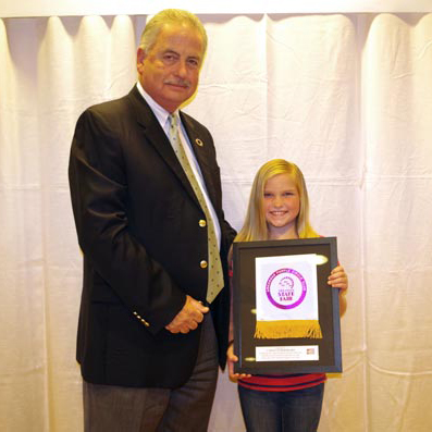 Carlee Summerford of Jacksonville was inducted Oct. 26 into the Arkansas Purple Circle Club in Little Rock. Rodney Baker, Arkansas Farm Bureau executive vice president, presented the award. The club is an awards program recognizing junior livestock exhibitors who earned championship honors at the Arkansas State Fair and is sponsored by Arkansas Farm Bureau.