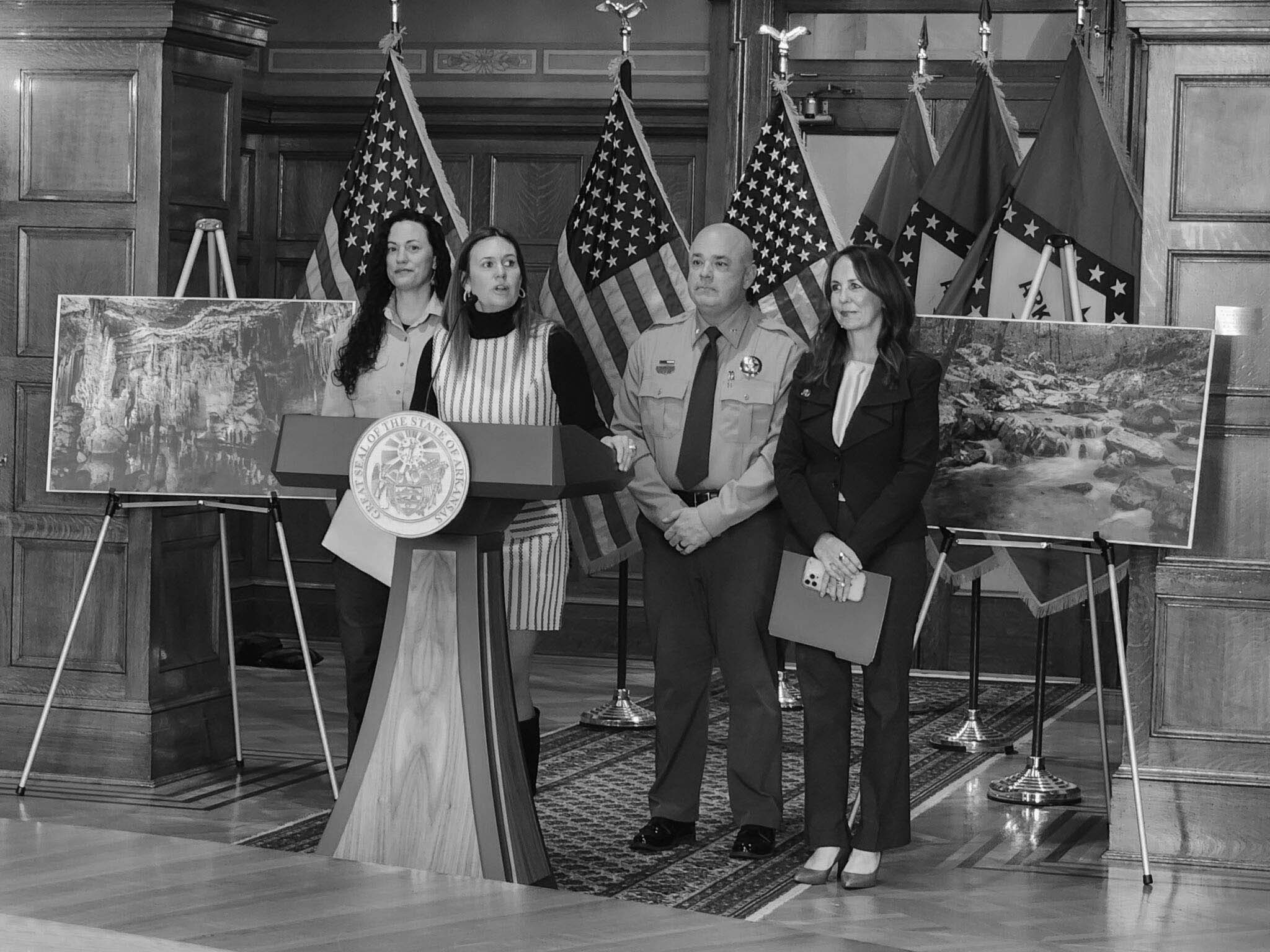 From left: Deputy Regional Forester Mary Moore of the U.S. Forest Service; Arkansas Gov. Sarah Huckabee Sanders; Parks, Heritage and Tourism Secretary Shea Lewis; and state Sen. Missy Irvin, R-Mountain View, announce the effort to designate Blanchard Springs Caverns as a state park on Dec. 8, 2025.